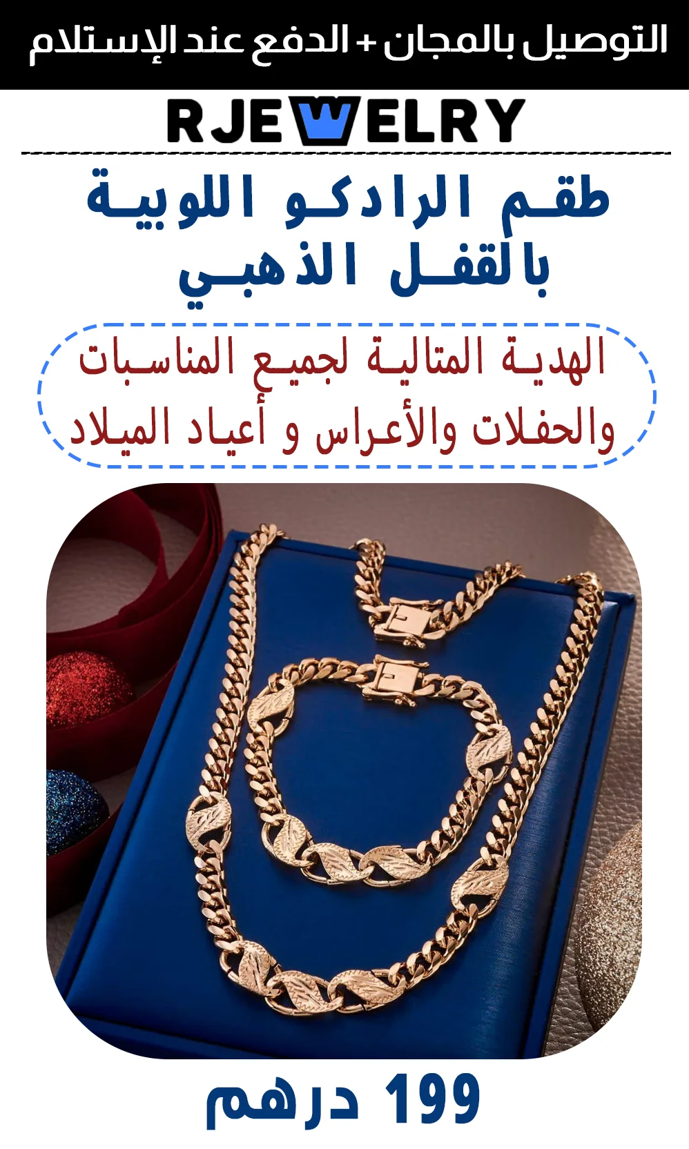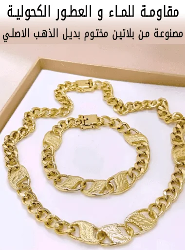 الطقم مكون من غرميط يد أنيقة و كولي رادكو اللوبية الأصلية المعروفة بالقفل الدهبي. الهدية المثالية لجميع المناسبات والحفلات والأعراس وأعياد الميلاد والأهم أنها صالحة كذلك للاستعمال اليومي ,مقاومة للماء و العطور الكحولية فهي مصنوعة من بلاتين مختوم بديل الذهب الاصلي