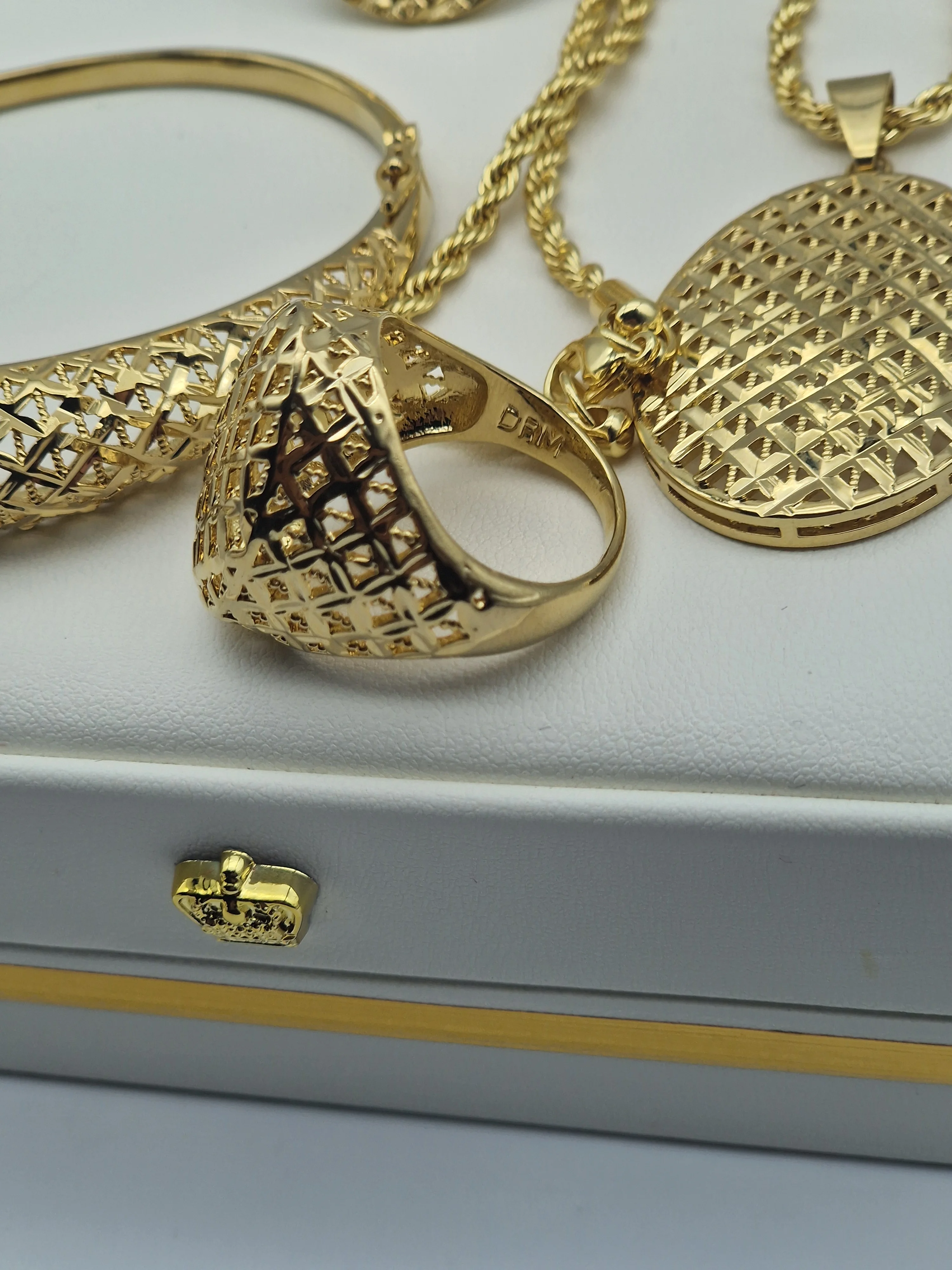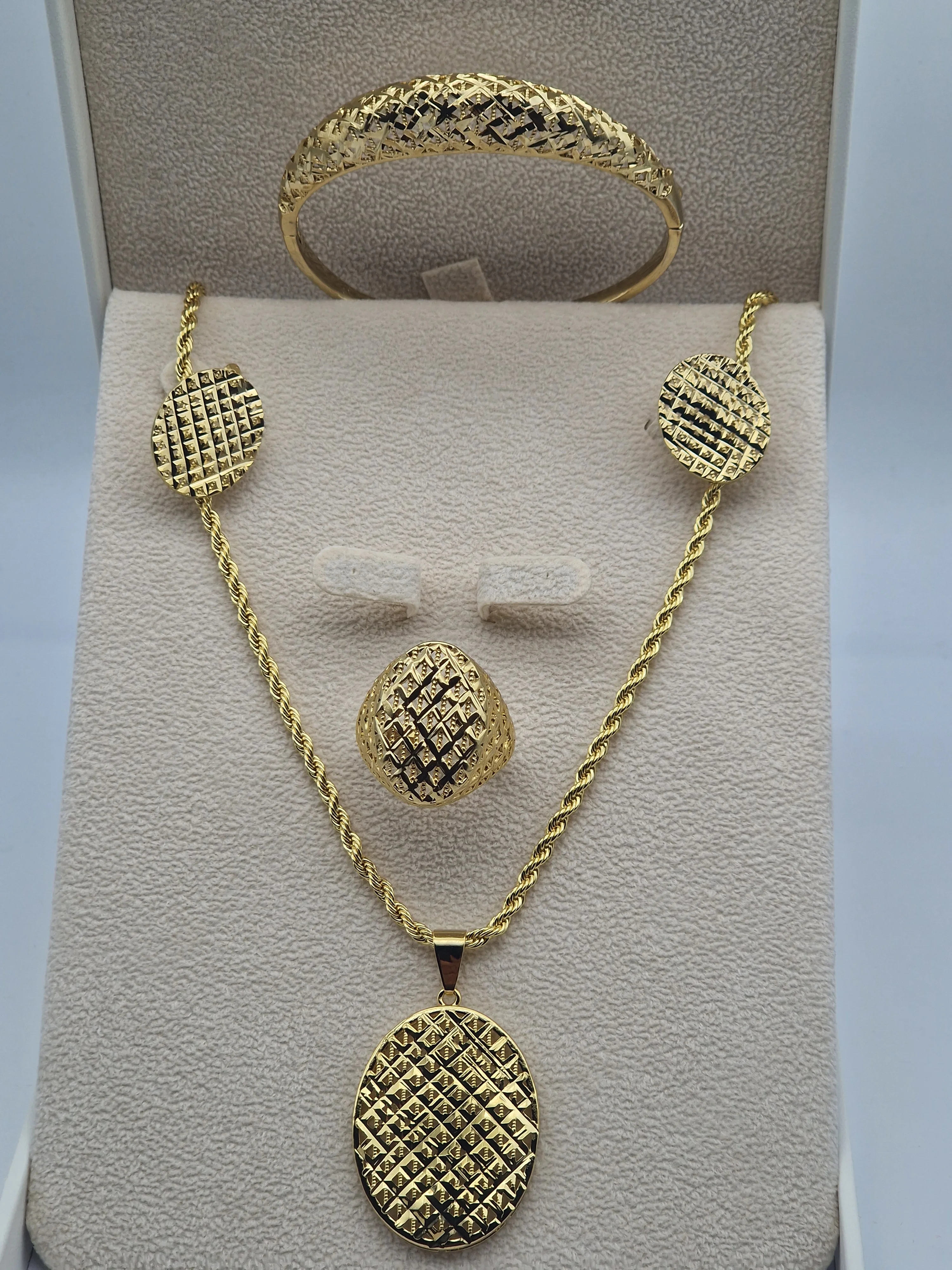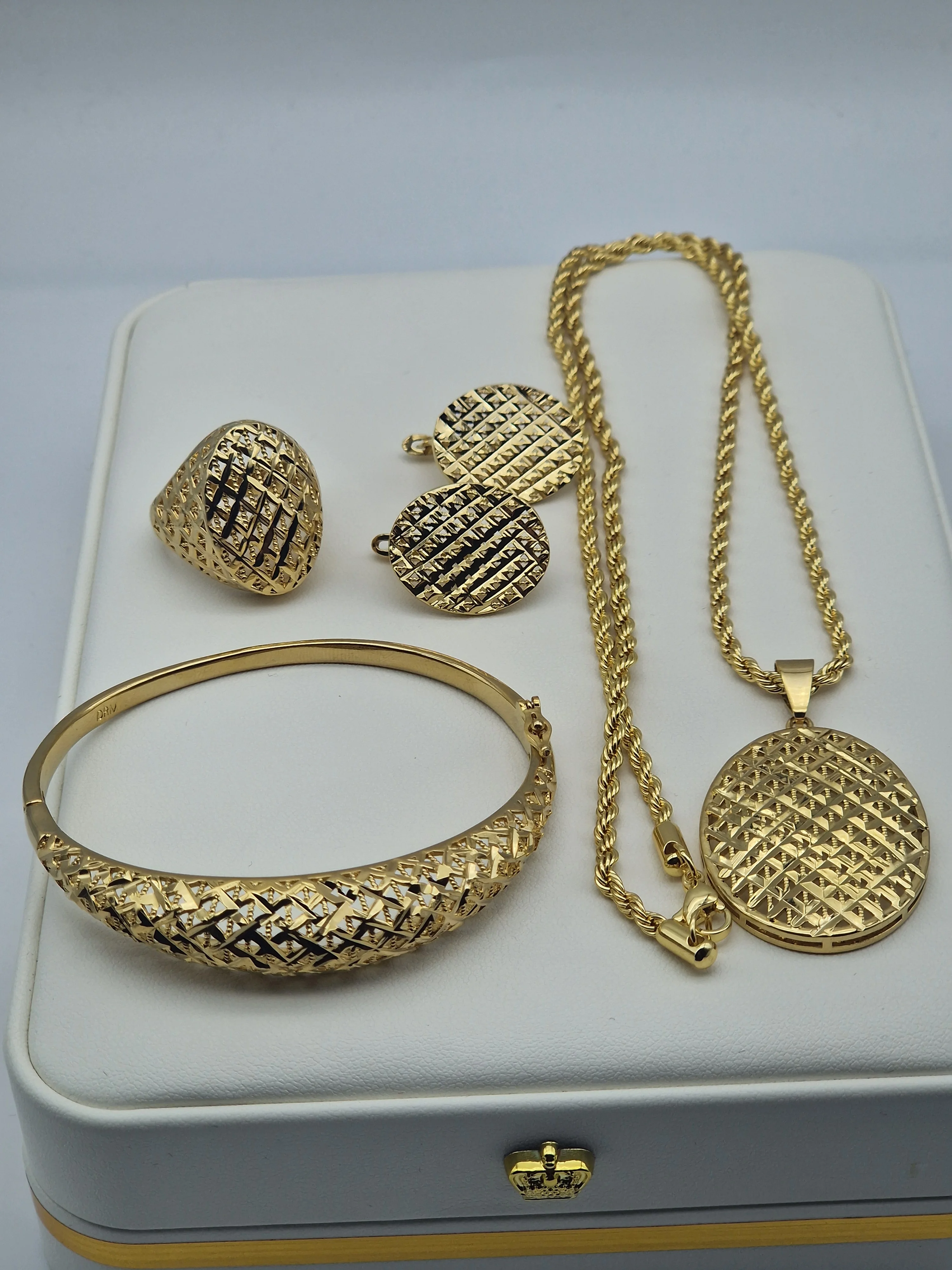 يتكون من: ✔️ عقد بسلسلة أنيقة مع مدالية دائرية منقوشة ✔️ سوار بنقشة متناسقة ✔️ خاتم ستايل كلاسيك عصري ✔️ حلق متناسق مع التصميم